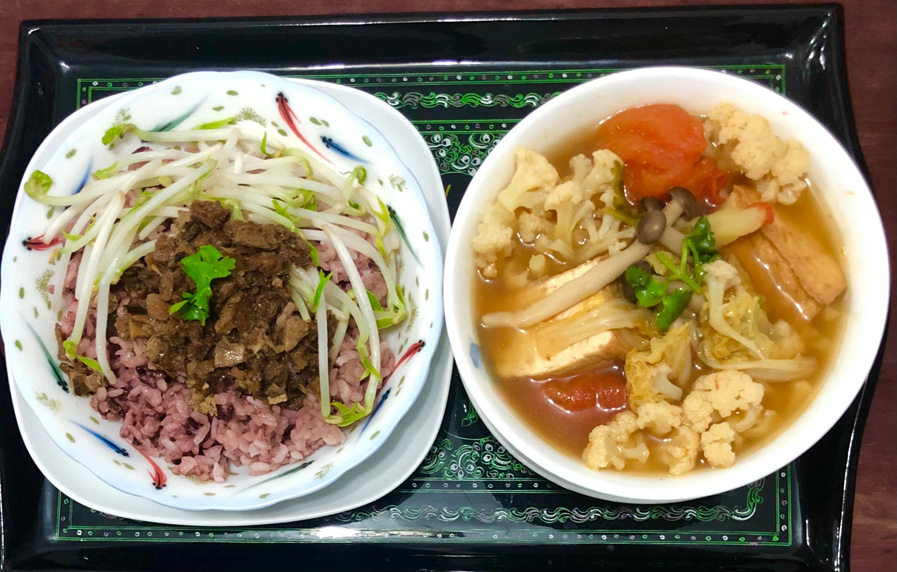 作法:白米+紫米先煮熟,豆芽菜川燙好,盛飯一碗鋪上豆芽菜再上素肉燥即可。