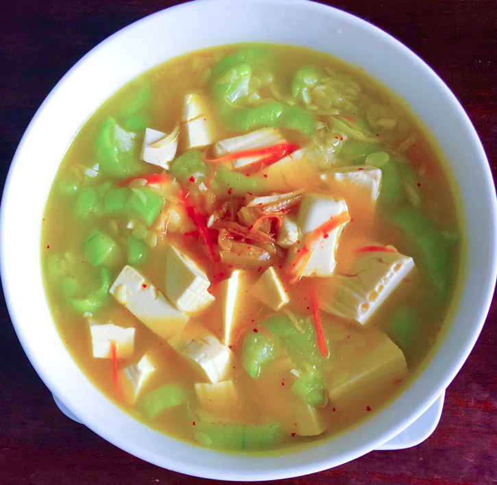 作法:鍋内放油倒入味噌炒香加水煮湯先下馬鈴薯稍煮+番茄稍煮+豆腐+菇+甜不辣+櫛瓜煮滾,待馬鈴薯熟+小白菜煮滾+青辣椒起鍋。