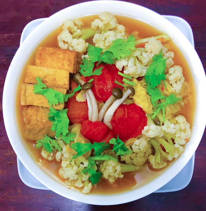 材料:白花椰菜、番茄、柳香菇、油豆腐、豆瓣醬。