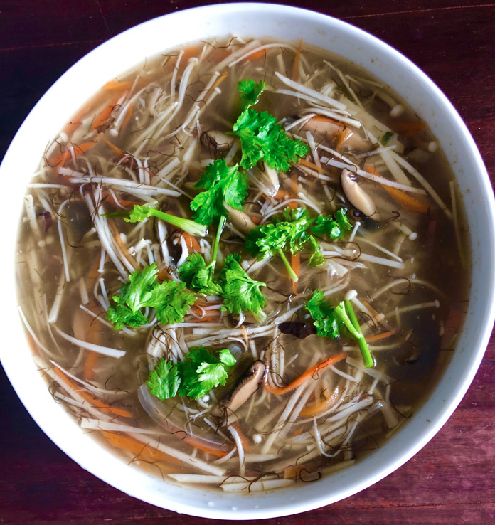 作法:先將髪菜洗净川燙備用,紅蘿蔔、筍、白菜梗、甜不辣切絲,香菇切絲炒香備用,另一鍋放水+筍絲先煮滾+其他料一起下煮出筍香+芡+胡椒粉+素食烏醋關火+香油即可。