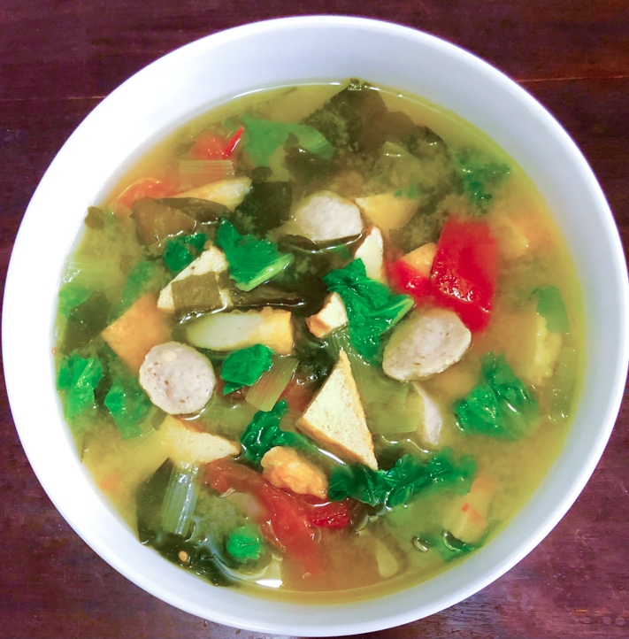 作法:湯鍋水燒開下番茄海帶芽煮滾+味噌+加入甜不辣,煮開之後再放入白菜煮開即可。