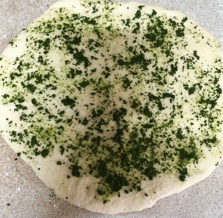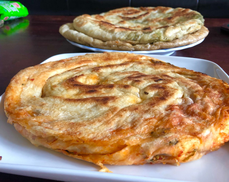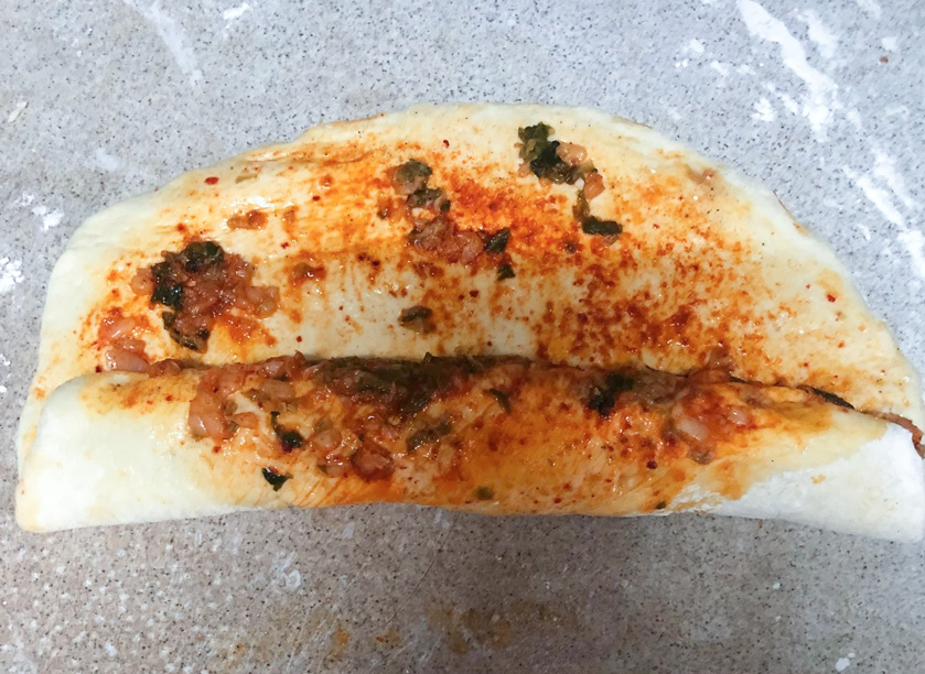 作法:把麵粉倒入盆中,準備一碗溫水(稍溫即可) 發粉倒入碗中一分鐘,倒入盆中把麵一起揉勻,揉成團用蓋子蓋起來等 30 分鐘取出再揉成三粒,用擀麵棍擀成圓形攤開放鹽、香油、辣椒粉、泡菜 (或香椿),口味隨意,捲起揉圓再攤開成圓形即可下鍋,小火煎至兩面黃即可。